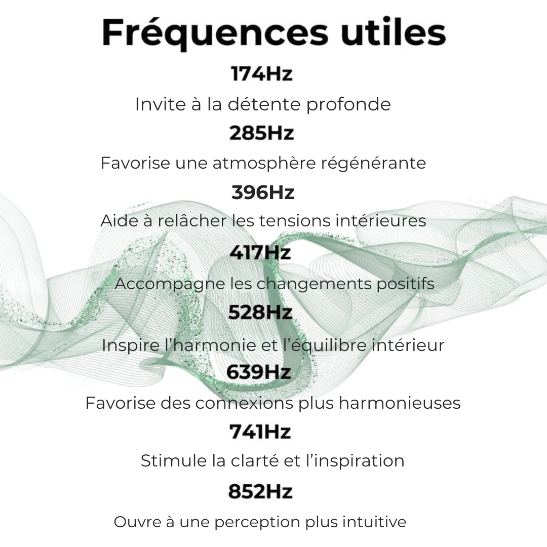 Nous vous recommandons de profiter d’une session d’environ 15 à 20 minutes pour chaque fréquence, et vous pouvez répéter plusieurs fois dans la journée selon vos envies.